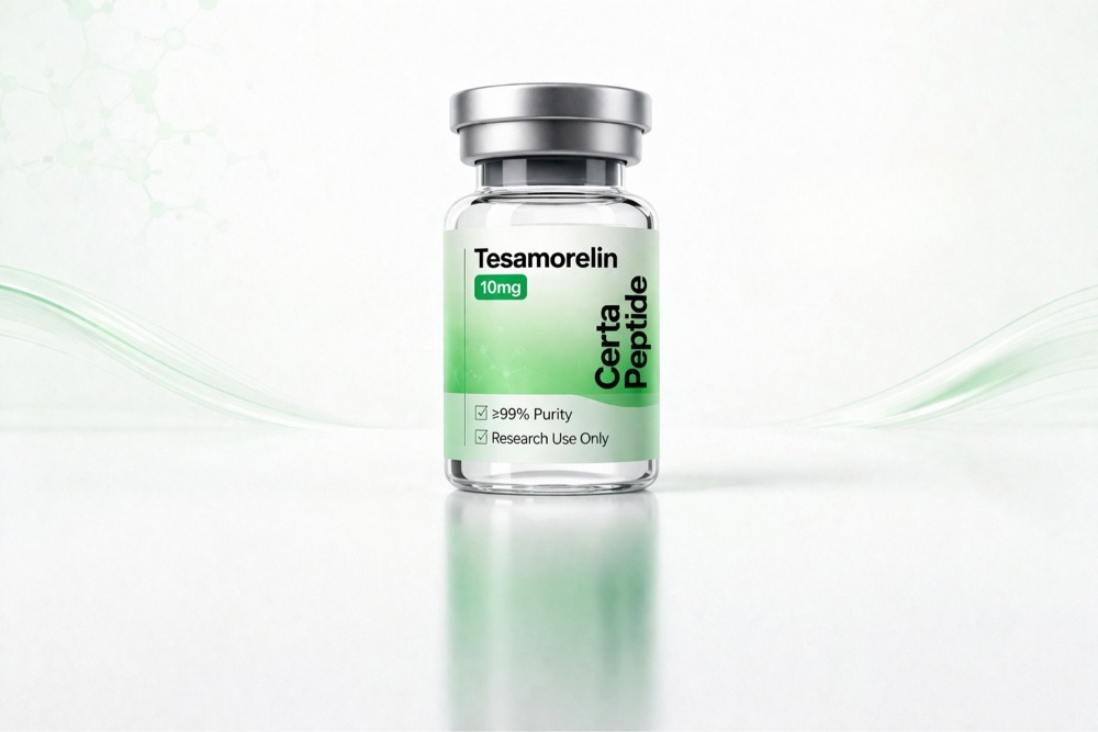 Tesamorelin is a synthetic peptide analog of growth hormone-releasing hormone (GHRH) and is studied in laboratory environments for its role in endocrine signaling pathways.